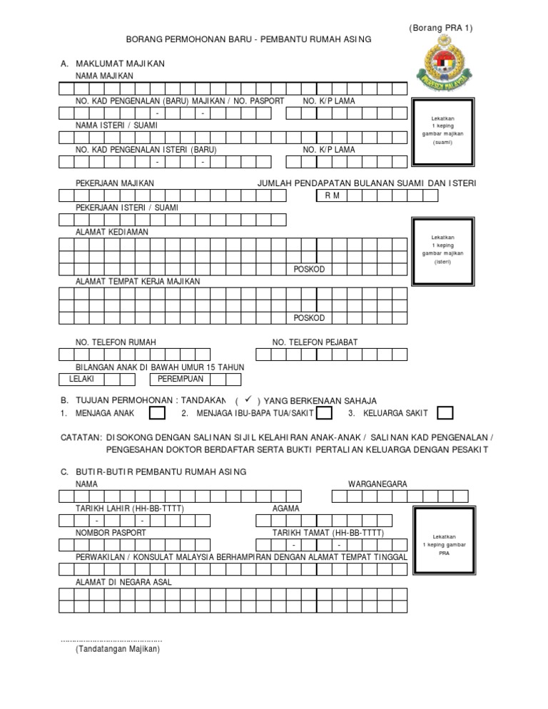 Borang Laporan Pekerja Asing Melarikan Diri dari Majikan yang dikeluarkan oleh Jabatan Imigresen Malaysia. Syarat-syarat permohonan lanjutan pembantu rumah asing PRA Berikut adalah syarat permohonan untuk pembantu rumah asing. Sila kirimkan salinan asal dari dokumen-dokumen sokongan sekiranya belum berbuat demikian.